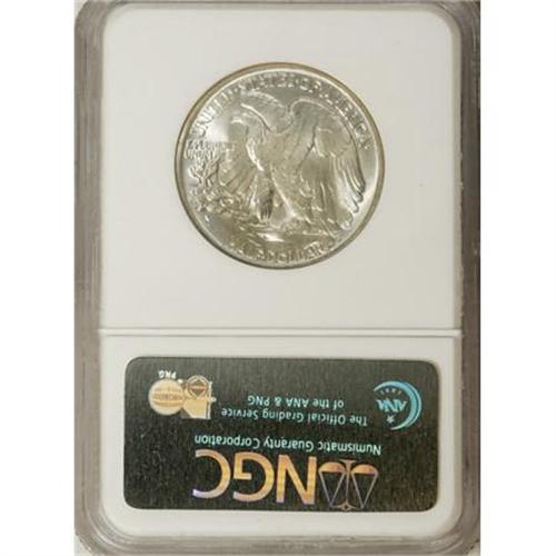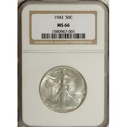 <B>1943 50C MS66 NGC.</B></I> NGC Census: (2333/384). PCGS Population (2318/275). Mintage: 53,190,000. Numismedia Wsl. Price for NGC/PCGS coin in MS66: $170. (#6618)<BR><BR><B>Coin Engraver:</B> Adolph A. Weinman<BR><BR><b>Shipping:</b> Coins & Currency (<a target="_blank" href="http://www.heritageauctions.com/common/shipping.php">view shipping information</a>)