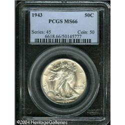 1943 50C MS66 PCGS. Lustrous surfaces are virtuall <B>1943 50C MS66 PCGS.</B></I> Lustrous surfaces are virtually white, and exhibit boldly impressed design features. A few minute ticks are seen on Liberty's left leg. <BR><BR><B>Important notice:</B> Heritage usually auctions material at the rate of 200-250 lots per hour. On some occasions eBay Live bid software or the Internet may not be able to keep up with the pace of the auction. We recommend placing a realistic absentee bid now as insurance to avoid disappointment. Occasionally the auctioneer may eliminate or reject an eBay Live bid, and the auctioneer may also reopen a lot after the close of the eBay live bidding (usually because we missed an audience bid), and may reject your bid even if it shows you as the winning bidder. By bidding via eBay Live, you agree that Heritage may award the lot to another bidder at its sole discretion under the circumstances described above or any other reasonable circumstances. Since eBay bids are not shown to us until we open the lot on the floor, we treat those bids just like floor bids. In most cases the floor responds before the eBay bid is presented to us, due to Internet lag time, so for consistency we have made it a policy that floor bids are always considered first over tie eBay live bids. Also please note that all Heritage lots purchased through eBay Live carry a 20% Buyer's Premium. Please make sure you read the Terms and Conditions before you bid. This lot is being auctioned in conjunction with a live floor auction by Heritage Galleries & Auctioneers. All final auction and invoice information will be supplied by Heritage Galleries & Auctioneers, and all other information should be considered preliminary. Lot:6232