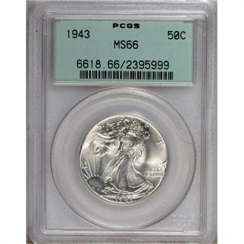 <B>1943 50C MS66 PCGS.</B></I> PCGS Population (2313/274). NGC Census: (2329/383). Mintage: 53,190,000. Numismedia Wsl. Price for NGC/PCGS coin in MS66: $160. (#6618)<BR><BR><B>Coin Engraver:</B> Adolph A. Weinman<BR><BR><b>Shipping:</b> Coins & Currency (<a target="_blank" href="http://www.heritageauctions.com/common/shipping.php">view shipping information</a>\)