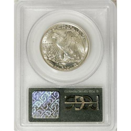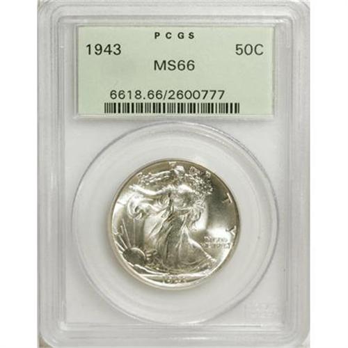 <B>1943 50C MS66 PCGS.</B></I> PCGS Population (2316/274). NGC Census: (2330/384). Mintage: 53,190,000. Numismedia Wsl. Price for NGC/PCGS coin in MS66: $160. (#6618)<BR><BR><B>Coin Engraver:</B> Adolph A. Weinman<BR><BR><b>Shipping:</b> Coins & Currency (<a target="_blank" href="http://www.heritageauctions.com/common/shipping.php">view shipping information</a>\)