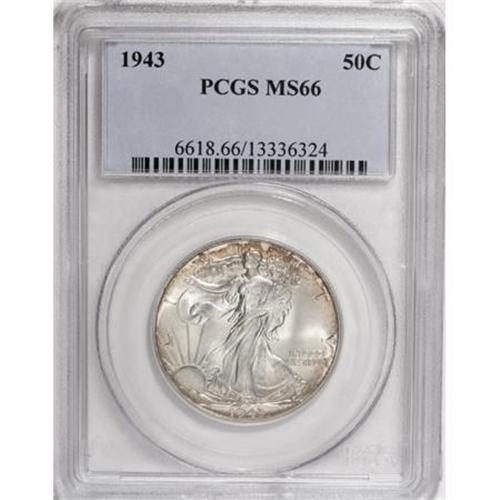 <B>1943 50C MS66 PCGS.</B></I> PCGS Population (2357/277). NGC Census: (2342/377). Mintage: 53,190,000. Numismedia Wsl. Price for NGC/PCGS coin in MS66: $200. (#6618)<BR><BR><B>Coin Engraver:</B> Adolph A. Weinman<BR><BR><b>Shipping:</b> Coins & Currency (<a target="_blank" href="http://www.heritageauctions.com/common/shipping.php">view shipping information</a>)