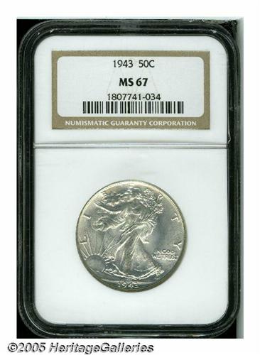 <B>1943<50C> MS67 NGC.</B></I> As is typically the case, this 1943 is sharply detailed in all areas, including on Liberty's head and left thumb, and on the gown lines. The surfaces exude radiant luster, and display traces of light tan patina. A couple of miniscule marks on each side are mentioned for accuracy, and are in no way offensive. NGC and PCGS combined have seen just nine coins rated finer (5/05).