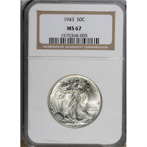 <B>1943 50C MS67 NGC.</B></I> An amazing Superb Gem, this lovely piece has frosty luster with intense silver brilliance. It is sharply struck and presents exceptional aesthetic appeal. Only four finer examples have been certified by NGC (6/07).<BR><BR><b>Shipping:</b> Coins & Currency (<a target="_blank" href="http://www.heritageauctions.com/common/shipping.php">view shipping information</a>)