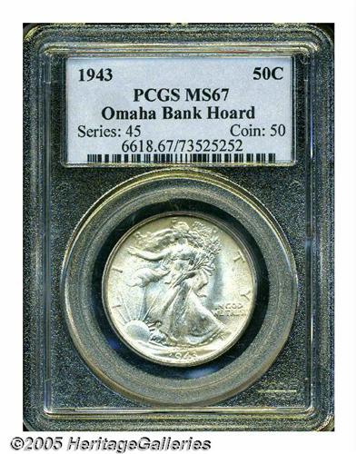 <B>1943<50C> MS67 PCGS.</B></I> Omaha Bank Hoard. Outstanding mint luster and fullness of strike are the two characteristics of 1943 halves, and so it is with this coin. The centers are brilliant with a light dusting of patina around the margins.