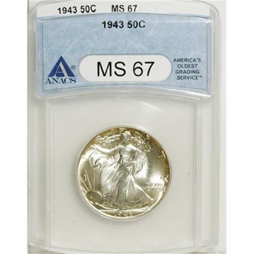 <B>1943 50C MS67 PCGS.</B></I> PCGS Population (269/5). NGC Census: (380/4). Mintage: 53,190,000. Numismedia Wsl. Price for NGC/PCGS coin in MS67: $650. (#6618)<BR><BR><B>Coin Engraver:</B> Adolph A. Weinman<BR><BR><b>Shipping:</b> Coins & Currency (<a target="_blank" href="http://www.heritageauctions.com/common/shipping.php">view shipping information</a>\)