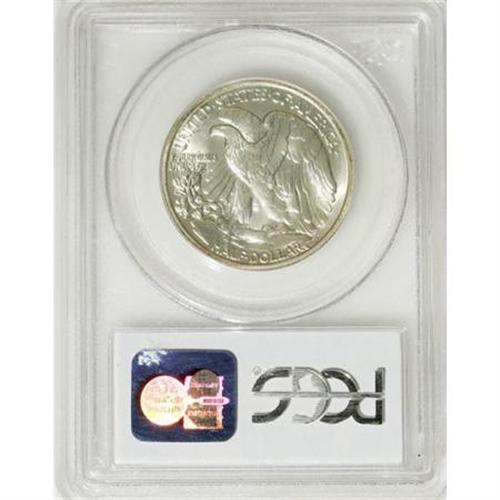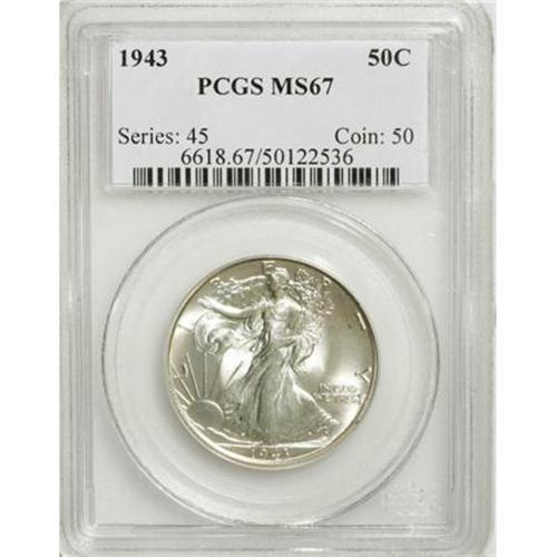 <B>1943 50C MS67 PCGS.</B></I> PCGS Population (261/5). NGC Census: (378/4). Mintage: 53,190,000. Numismedia Wsl. Price for NGC/PCGS coin in MS67: $650. (#6618)<BR><BR><B>Coin Engraver:</B> Adolph A. Weinman<BR><BR><b>Shipping:</b> Coins & Currency (<a target="_blank" href="http://www.heritageauctions.com/common/shipping.php">view shipping information</a>\)