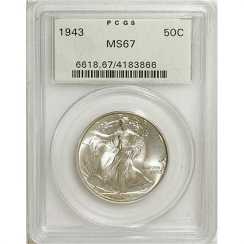 <B>1943 50C MS67 PCGS.</B></I> PCGS Population (269/5). NGC Census: (380/4). Mintage: 53,190,000. Numismedia Wsl. Price for NGC/PCGS coin in MS67: $650. (#6618)<BR><BR><B>Coin Engraver:</B> Adolph A. Weinman<BR><BR><b>Shipping:</b> Coins & Currency (<a target="_blank" href="http://www.heritageauctions.com/common/shipping.php">view shipping information</a>\)