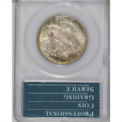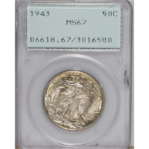<B>1943 50C MS67 PCGS.</B></I> This magnificent Superb Gem is bathed in original olive and golden toning. Sharply struck and lustrous with exceptional preservation. Certified in a first generation holder. As of (7/07), only five finer pieces have been graded by PCGS.<BR><BR><B>Coin Engraver:</B> Adolph A. Weinman<BR><BR><b>Shipping:</b> Coins & Currency (<a target="_blank" href="http://www.heritageauctions.com/common/shipping.php">view shipping information</a>)