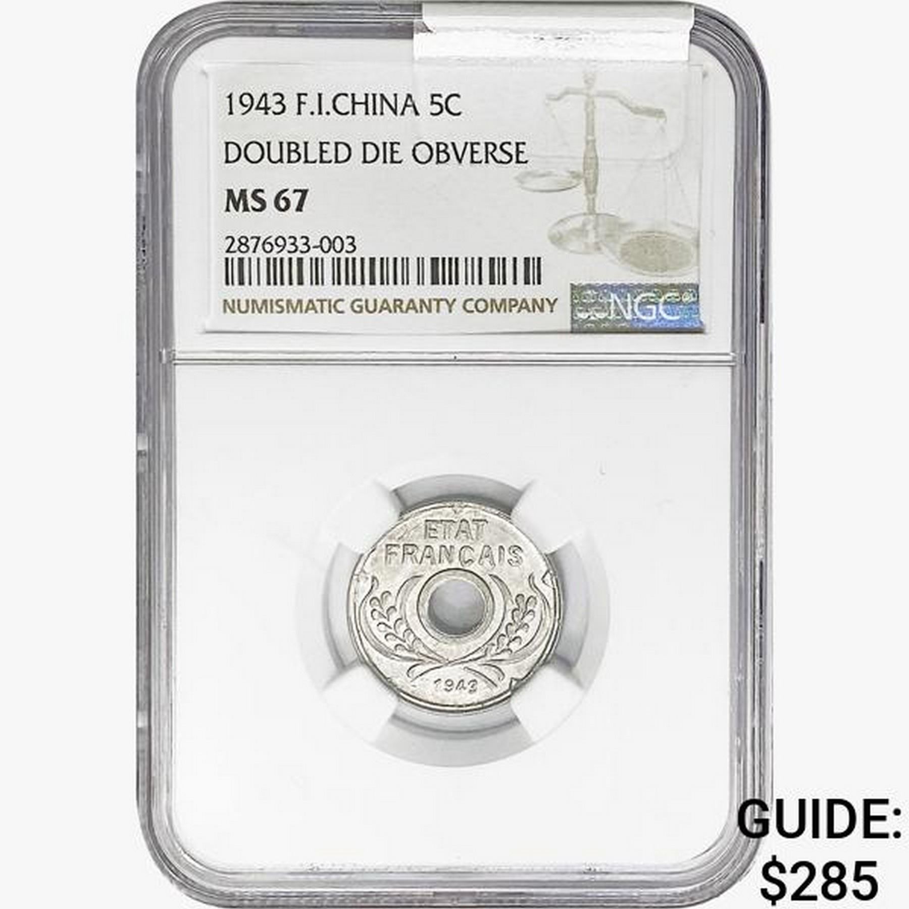 1943 5C F.I. China NGC MS67 DBL Die Obverse