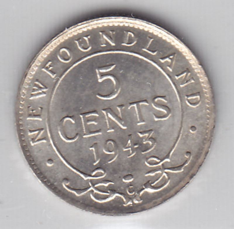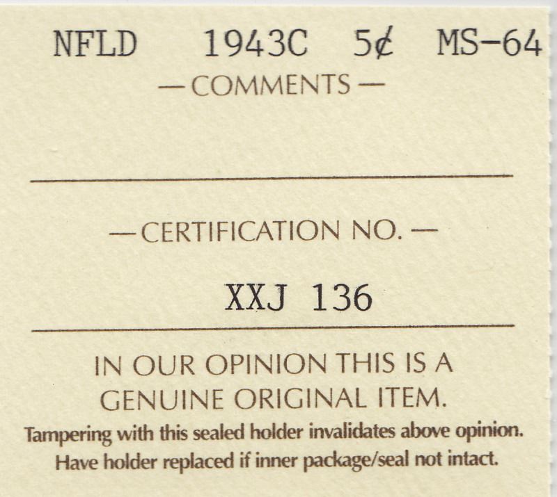 1943 Newfoundland Canada Silver 5-Cent Coin - Graded By ICCS - MS 64 - "C" Mint Mark - Trends Value $ 150