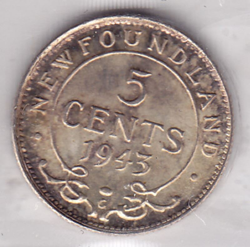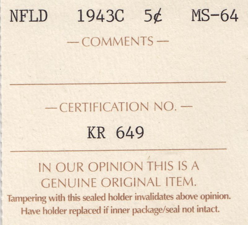 1943-C Newfoundland Canada Silver 5-Cent Coin - Graded By ICCS MS-64 (KR 649)