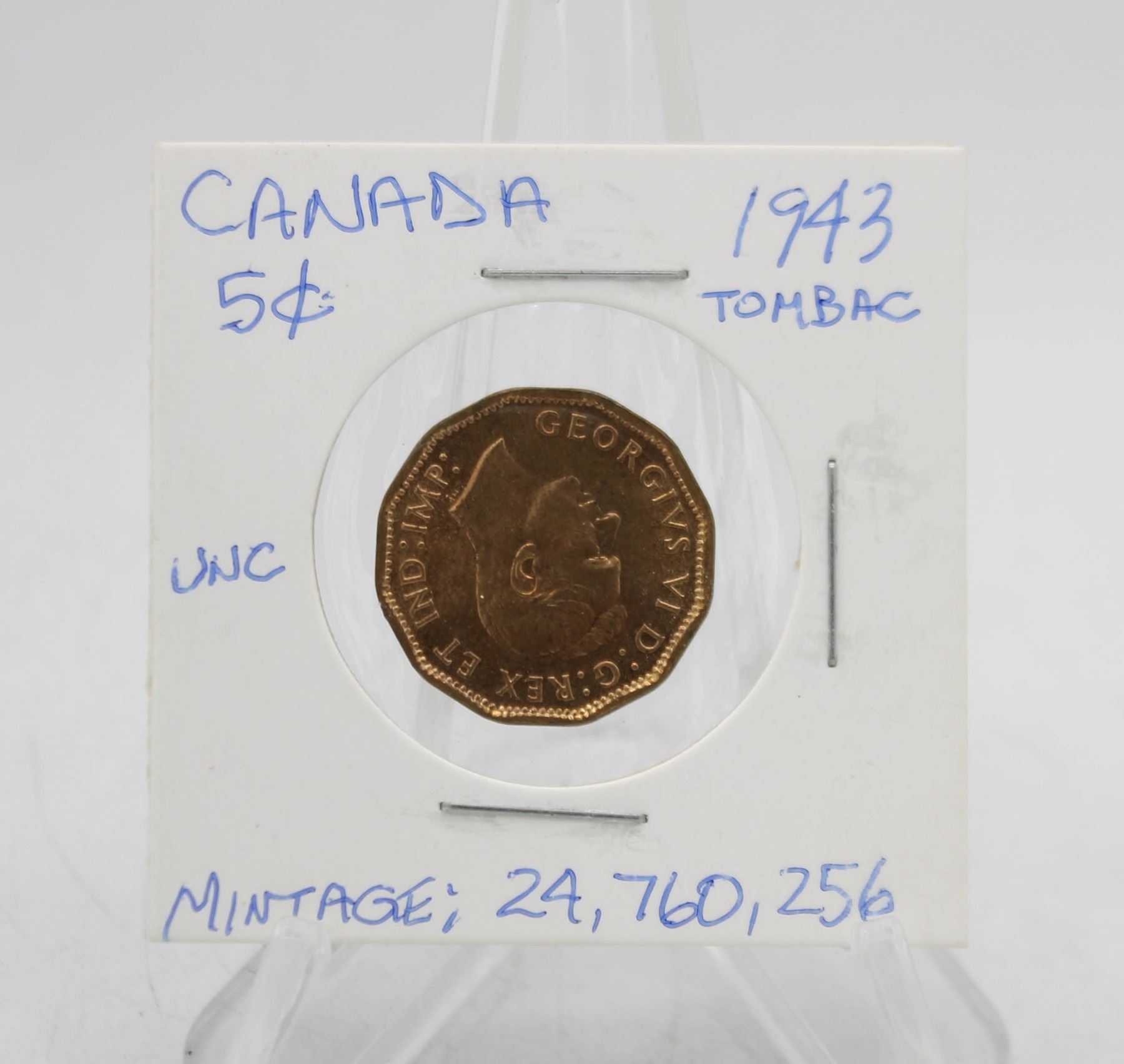 1943 CANADA 5 CENT COIN. TOMBAC. UNCIRCULATED.