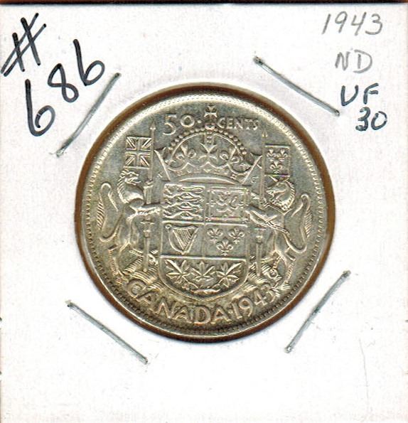 1943 CANADIAN SILVER 50 CENT COIN - Narrow Date
