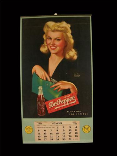 1943 Calendar for Dr. Pepper, artist Earl Moran, Bigelow Press Co. St.Paul, MN. December page only with original band on top. Mint condition. 13 1/2 X 25 inches.