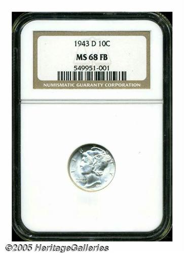 <B>1943-D<10C> MS68 Full Bands NGC.</B></I> A brilliant and near-perfect example of this popular Short Set issue. The surfaces display shimmering mint luster and add an extra dimension of visual interest to this lovely type coin.