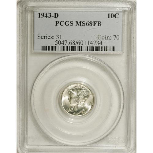 <B>1943-D 10C MS68 Full Bands PCGS.</B></I> Bright and completely untoned, this Superb Gem dime has been carefully preserved for the past 60-plus years. No surface faults are noted on either side. Population: 22 in 68 Full Bands, 0 finer (2/07).<BR><BR><b>Shipping:</b> Coins & Currency (<a target="_blank" href="http://www.heritageauctions.com/common/shipping.php">view shipping information</a>)