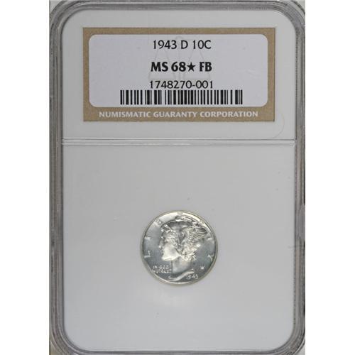 <B>1943-D 10C MS68 <img border='0' src='http://www.heritagecoins.com/images/star.gif' width=10 height=10> Full Bands NGC.</B></I> This lovely piece has a small spot of toning behind the neck and light haze in the fields. Otherwise, the highly lustrous surfaces are untoned, and the strike is sharp. Census: 2 in 68 <img border='0' src='http://www.heritagecoins.com/images/star.gif' width=10 height=10> Full Bands, 0 finer (11/06).<BR><BR><b>Shipping:</b> Coin/Currency (<a target="_blank" href="http://www.heritageauctions.com/common/shipping.php">view shipping information</a>)