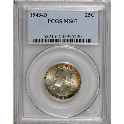 <B>1943-D 25C MS67 PCGS.</B></I> Vivid russet-orange patina graces the rims of this shining Superb Gem. Nicely detailed overall, and tied for the finest certified by either NGC or PCGS (1/07).<BR><BR><b>Shipping:</b> Coins & Currency (<a target="_blank" href="http://www.heritageauctions.com/common/shipping.php">view shipping information</a>)
