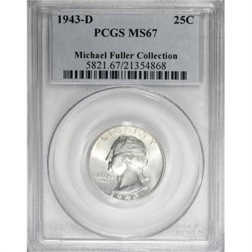 <B>1943-D 25C MS67 PCGS.</B></I> Fully struck, save for slight flatness on a few peripheral elements, and untoned with full satiny luster and impressive surface preservation. A faint pinscratch, in the upper left obverse field, is too trivial to challenge the assigned grade. Population: 36 in 67, 0 finer (8/07). <BR><I>From The Michael Fuller Collection.</B></I><BR><BR><B>Coin Engraver:</B> John Flanagan<BR><BR><b>Shipping:</b> Coins & Currency (<a target="_blank" href="http://www.heritageauctions.com/common/shipping.php">view shipping information</a>)