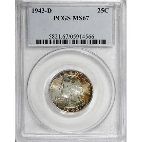 <B>1943-D 25C MS67 PCGS.</B></I> Splashes of apple-green, peach, and gold patina visit the obverse margins, while the center of that side and the reverse are strongly lustrous and essentially untoned. A delightful Superb Gem that shows a hint of satin. Population: 36 in 67, 0 finer (2/08).<BR><BR><B>Coin Engraver:</B> John Flanagan<BR><BR><b>Shipping:</b> Coins & Currency (<a target="_blank" href="http://www.heritageauctions.com/common/shipping.php">view shipping information</a>)
