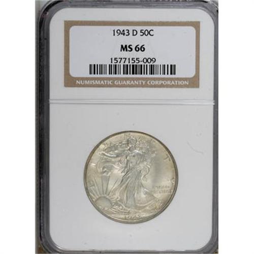 <B>1943-D 50C MS66 NGC.</B></I> NGC Census: (1129/213). PCGS Population (1352/196). Mintage: 11,346,000. Numismedia Wsl. Price for NGC/PCGS coin in MS66: $280. (#6619)<BR><BR><B>Coin Engraver:</B> Adolph A. Weinman<BR><BR><b>Shipping:</b> Coins & Currency (<a target="_blank" href="http://www.heritageauctions.com/common/shipping.php">view shipping information</a>)