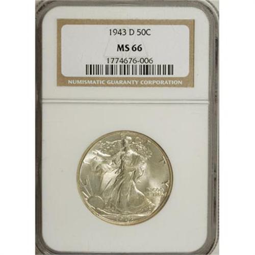 <B>1943-D 50C MS66 NGC.</B></I> NGC Census: (1129/213). PCGS Population (1352/196). Mintage: 11,346,000. Numismedia Wsl. Price for NGC/PCGS coin in MS66: $280. (#6619)<BR><BR><B>Coin Engraver:</B> Adolph A. Weinman<BR><BR><b>Shipping:</b> Coins & Currency (<a target="_blank" href="http://www.heritageauctions.com/common/shipping.php">view shipping information</a>)