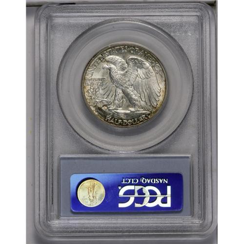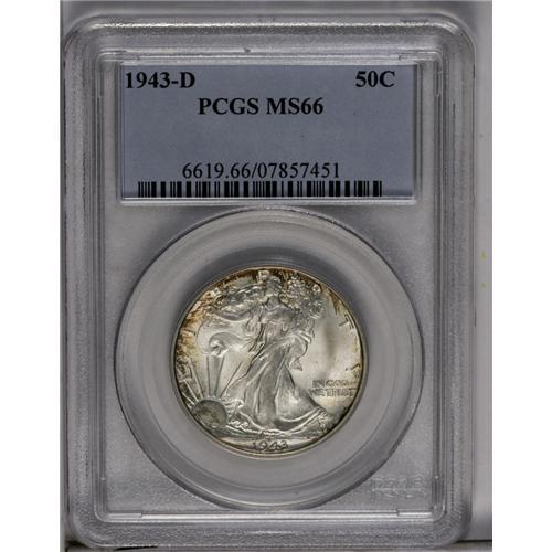 <B>1943-D<50C> MS66 PCGS.</B></I> Whispers of reddish-gold and golden-tan color gravitate toward the borders of this radiantly lustrous D-Mint Walker, and powerfully struck design elements are manifested in well incised gown lines and partial definition on the left thumb. Satiny surfaces are devoid of significant marks.
