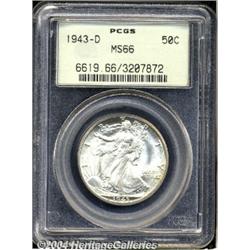 <B>1943-D<50C> MS66 PCGS.</B></I> Dazzling brilliance and fully struck throughout. An extraordinary Walker that must be seen to be fully appreciated. <BR><BR><B>Important notice:</B> Heritage usually auctions material at the rate of 200-250 lots per hour. On some occasions eBay Live bid software or the Internet may not be able to keep up with the pace of the auction. We recommend placing a realistic absentee bid now as insurance to avoid disappointment. Occasionally the auctioneer may eliminate or reject an eBay Live bid, and the auctioneer may also reopen a lot after the close of the eBay live bidding (usually because we missed an audience bid), and may reject your bid even if it shows you as the winning bidder. By bidding via eBay Live, you agree that Heritage may award the lot to another bidder at its sole discretion under the circumstances described above or any other reasonable circumstances. Since eBay bids are not shown to us until we open the lot on the floor, we treat those bids just like floor bids. In most cases the floor responds before the eBay bid is presented to us, due to Internet lag time, so for consistency we have made it a policy that floor bids are always considered first over tie eBay live bids. Also please note that all Heritage lots purchased through eBay Live carry a 20% Buyer's Premium. Please make sure you read the Terms and Conditions before you bid.