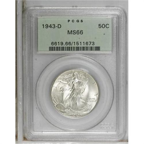 <B>1943-D 50C MS66 PCGS.</B></I> PCGS Population (1354/196). NGC Census: (1129/213). Mintage: 11,346,000. Numismedia Wsl. Price for NGC/PCGS coin in MS66: $280. (#6619)<BR><BR><B>Coin Engraver:</B> Adolph A. Weinman<BR><BR><b>Shipping:</b> Coins & Currency (<a target="_blank" href="http://www.heritageauctions.com/common/shipping.php">view shipping information</a>)