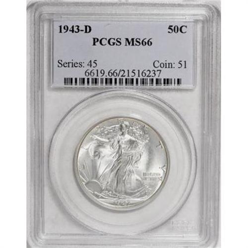 <B>1943-D 50C MS66 PCGS.</B></I> PCGS Population (1361/195). NGC Census: (1134/214). Mintage: 11,346,000. Numismedia Wsl. Price for NGC/PCGS coin in MS66: $280. (#6619)<BR><BR><B>Coin Engraver:</B> Adolph A. Weinman<BR><BR><b>Shipping:</b> Coins & Currency (<a target="_blank" href="http://www.heritageauctions.com/common/shipping.php">view shipping information</a>)