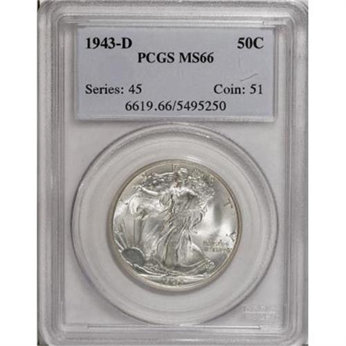 <B>1943-D 50C MS66 PCGS.</B></I> PCGS Population (1363/195). NGC Census: (1134/214). Mintage: 11,346,000. Numismedia Wsl. Price for NGC/PCGS coin in MS66: $280. (#6619)<BR><BR><B>Coin Engraver:</B> Adolph A. Weinman<BR><BR><b>Shipping:</b> Coins & Currency (<a target="_blank" href="http://www.heritageauctions.com/common/shipping.php">view shipping information</a>)
