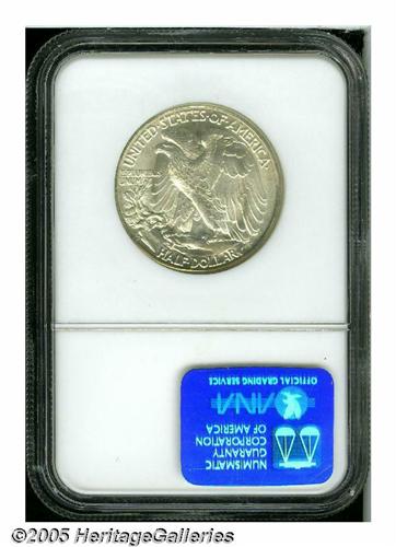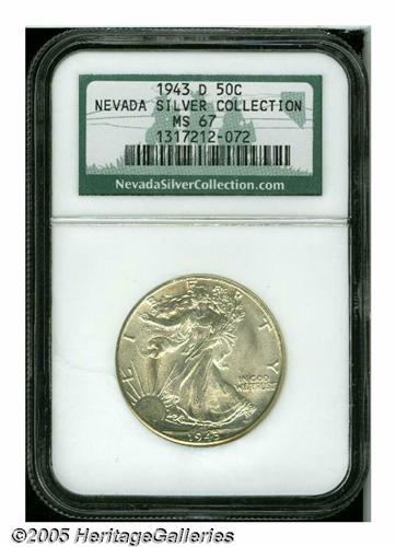 <B>1943-D<50C> MS67 NGC.</B></I> Ex: Nevada Silver Collection. This D-mint issue emits a soft, lustrous glow beneath faint patina on each side. Crisply struck design features dominate, including sharp detail on Liberty's head and thumb of the left hand, and in the gown lines.