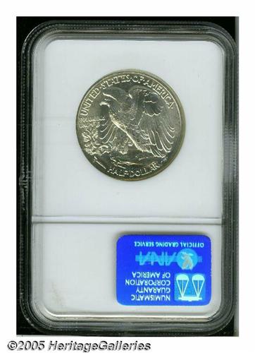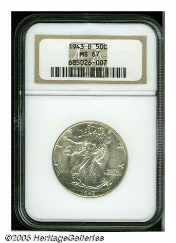 <B>1943-D<50C> MS67 NGC.</B></I> This Superb Gem is fully brilliant and sharply struck, and possesses exceptional aesthetic appeal. Few can equal this example for its beauty. Bruce Fox commented that this issue has the highest mintage of any Denver Mint Walker struck in the 1940s, and it also has the highest price structure among the same group of coins. NGC has certified just two finer examples (6/05).<BR><I>From The Robert Moreno Collection.</B></I>