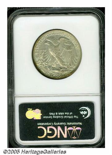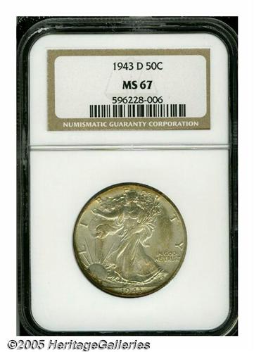 <B>1943-D<50C> MS67 NGC.</B></I> Touches of gold and pale violet color grace lustrous surfaces that are beautifully preserved. The design elements are adequately struck, though Liberty's left hand area is weak. A small milling mark on Liberty beneath the branches is mentioned for accuracy. NGC and PCGS combined have certified a mere 4 coins finer (5/05).