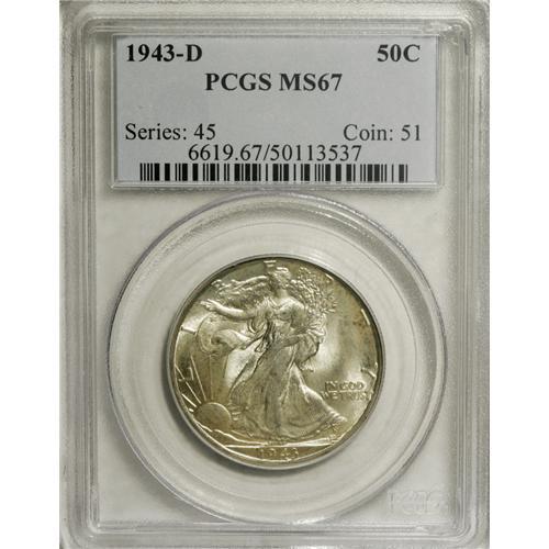 1943-D 50C MS67 PCGS. This gold-tinged Superb Gem has