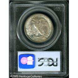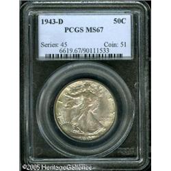 <B>1943-D 50C MS67 PCGS.</B></I> Vivid heather and steel toning over frosty silver luster. Just a couple finer examples have been certified by PCGS. A boldly struck example Population: 161 in 67, 2 finer (1/05). Lot:8136