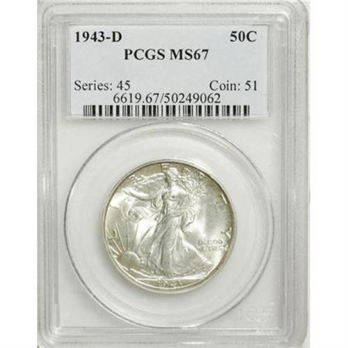 <B>1943-D 50C MS67 PCGS.</B></I> PCGS Population (186/2). NGC Census: (210/2). Mintage: 11,346,000. Numismedia Wsl. Price for NGC/PCGS coin in MS67: $625. (#6619)<BR><BR><B>Coin Engraver:</B> Adolph A. Weinman<BR><BR><b>Shipping:</b> Coins & Currency (<a target="_blank" href="http://www.heritageauctions.com/common/shipping.php">view shipping information</a>\)