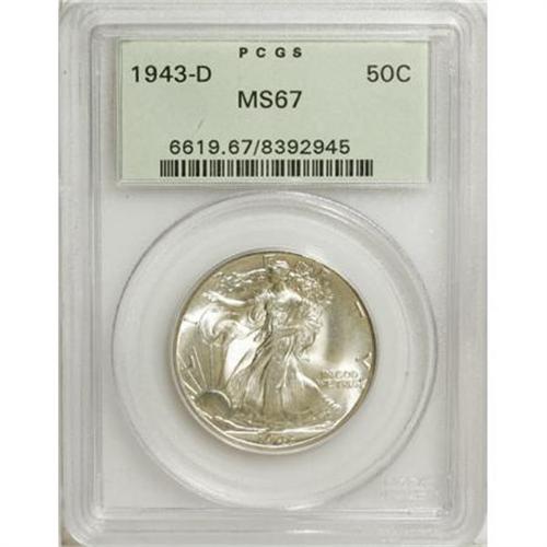 <B>1943-D 50C MS67 PCGS.</B></I> PCGS Population (193/2). NGC Census: (210/2). Mintage: 11,346,000. Numismedia Wsl. Price for NGC/PCGS coin in MS67: $625. (#6619)<BR><BR><B>Coin Engraver:</B> Adolph A. Weinman<BR><BR><b>Shipping:</b> Coins & Currency (<a target="_blank" href="http://www.heritageauctions.com/common/shipping.php">view shipping information</a>\)