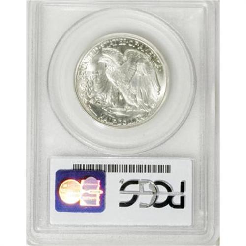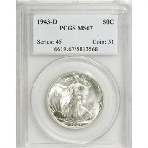 <B>1943-D 50C MS67 PCGS.</B></I> An essentially untoned and delightful Superb Gem example of this short-set issue, solidly struck with pleasing definition on the branch hand. Powerful luster shows a hint of satin. PCGS has certified a mere two finer examples (1/08).<BR><BR><B>Coin Engraver:</B> Adolph A. Weinman<BR><BR><b>Shipping:</b> Coins & Currency (<a target="_blank" href="http://www.heritageauctions.com/common/shipping.php">view shipping information</a>)