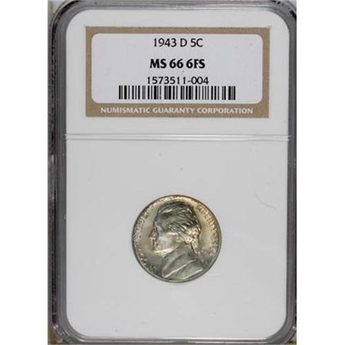 <B>1943-D 5C MS66 Full Steps NGC.</B></I> NGC Census: (518/310). PCGS Population (0/0). (#74020)<BR><BR><b>Shipping:</b> Coins & Currency (<a target="_blank" href="http://www.heritageauctions.com/common/shipping.php">view shipping information</a>)