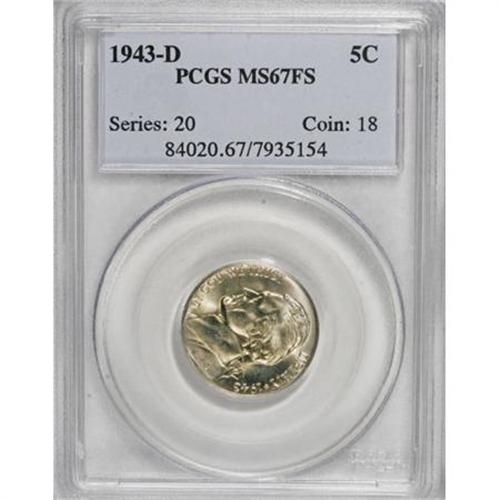 <B>1943-D 5C MS67 Full Steps PCGS.</B></I> PCGS Population (269/3). NGC Census: (86/1). (#84020)<BR><BR><b>Shipping:</b> Coins & Currency (<a target="_blank" href="http://www.heritageauctions.com/common/shipping.php">view shipping information</a>)