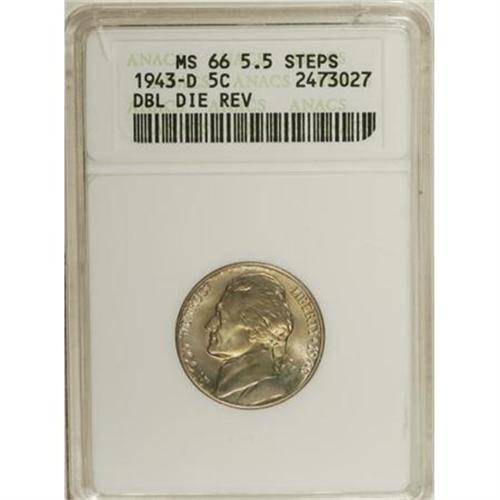 <B>1943-D 5C Double Die Reverse MS66 5.5 Steps ANACS.</B></I> NGC Census: (1972/2605). PCGS Population (1070/118). Mintage: 15,294,000. Numismedia Wsl. Price for NGC/PCGS coin in MS66: $21. (#4020)<BR><BR><b>Shipping:</b> Coins & Currency (<a target="_blank" href="http://www.heritageauctions.com/common/shipping.php">view shipping information</a>)