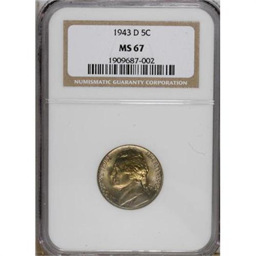 <B>1943-D 5C MS67 NGC.</B></I> NGC Census: (2598/5). PCGS Population (118/0). Mintage: 15,294,000. Numismedia Wsl. Price for NGC/PCGS coin in MS67: $40. (#4020)<BR><BR><b>Shipping:</b> Coins & Currency (<a target="_blank" href="http://www.heritageauctions.com/common/shipping.php">view shipping information</a>)