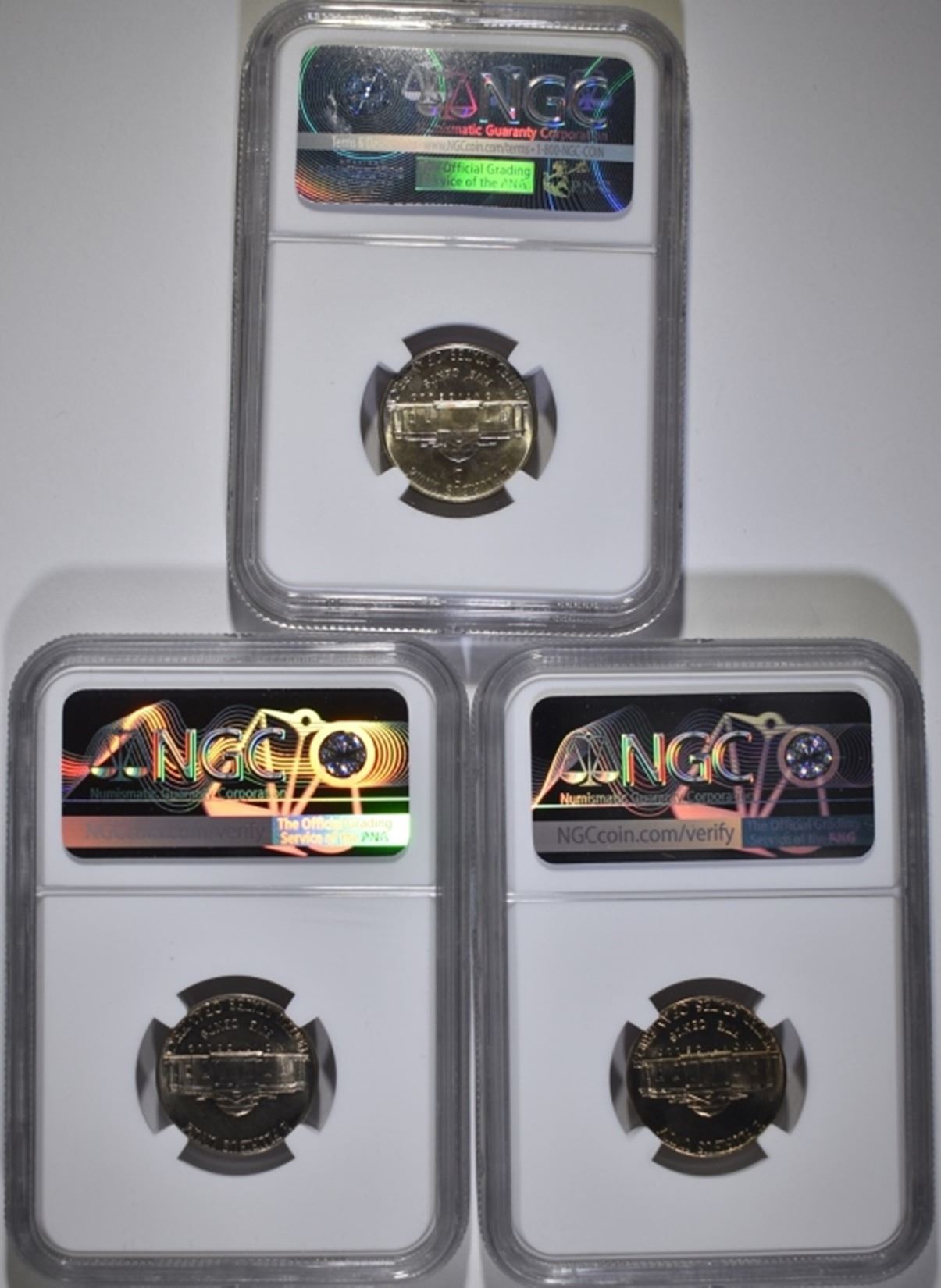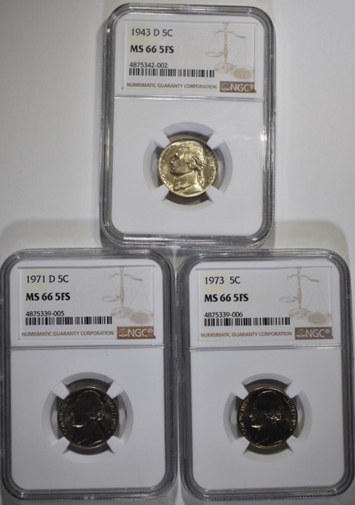 1943-D, 71-D & 73 JEFFERSON NICKELS, NGC MS-66 FS