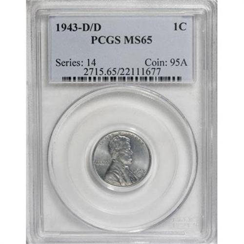 <B>1943-D/D 1C MS65 PCGS.</B></I> FS-019. The most dramatic repunched mintmark variety for the 1943-dated zinc-plated steel cents. The secondary mintmark is fully outlined and widely shifted southwest. The variety is both listed and photographed in the 2008 Guide Book. Intricately struck, lustrous, and splendidly smooth.<BR><BR><b>Shipping:</b> Coins & Currency (<a target="_blank" href="http://www.heritageauctions.com/common/shipping.php">view shipping information</a>)