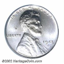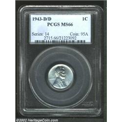 1943-D/D 1C MS66 PCGS. RPM-1. Lange states that 17 repunched mintmarks are known of this issue, but the most appealing and collectible one is from this dramatically repunched die. The surfaces are bright and "silvery" with a faint trace of oil-slick iridescence in the right obverse field. An exceptional, high grade, problem-free example of this scarce repunched mintmark. Population: 15 in 66, 6 finer (9/02). Important notice: We expect to be auctioning lots at the rate of 200-250 per hour. Sometimes eBay Premier live bid software cannot keep up with that pace, so we strongly recommend that you place a realistic proxy bid now as insurance to avoid disappointment. Also please note that all Heritage/CAA lots purchased through eBay Premier carry a 20% Buyer's Premium. Please make sure you read the Terms and Conditions.