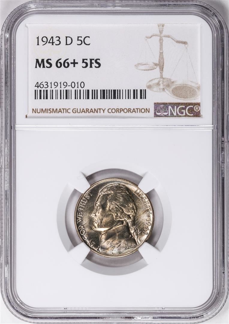 One 1943-D Jefferson Nickel Coin NGC MS66+ 5FS. NGC Certified.