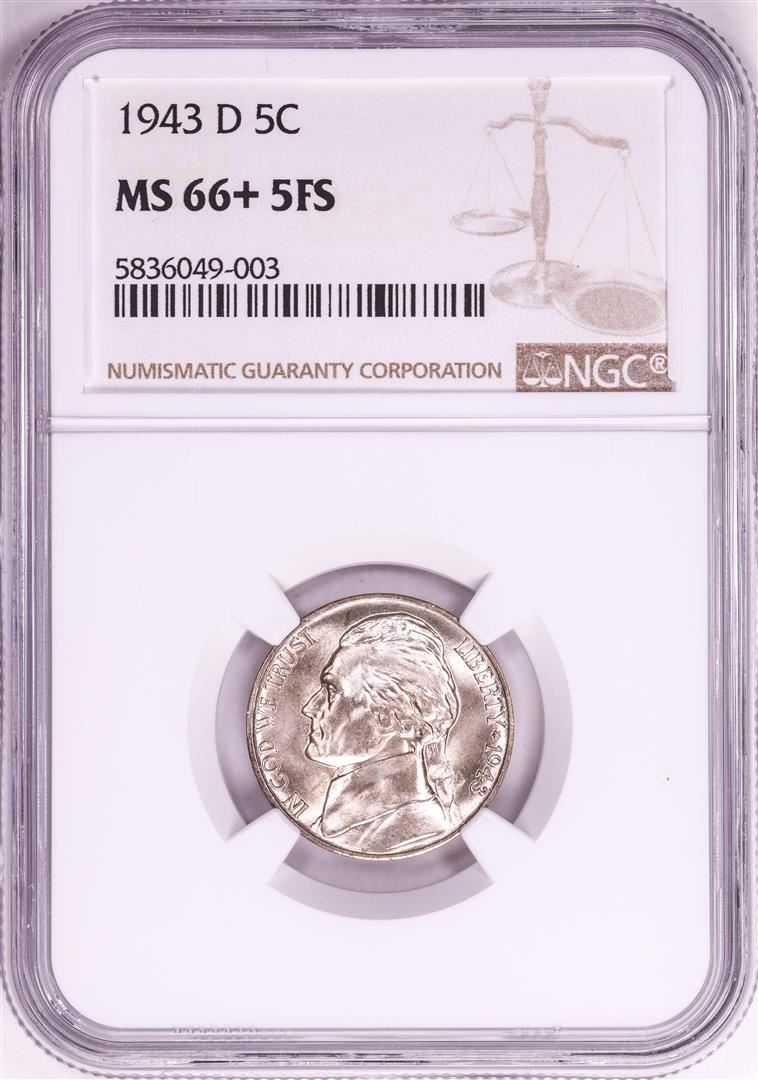 One 1943-D Jefferson Nickel Coin NGC MS66+ 5FS. NGC Certified.