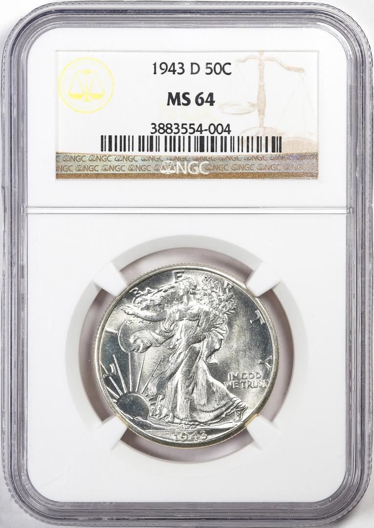 One 1943-D Walking Liberty Half Dollar Coin NGC MS64. NGC Certified.