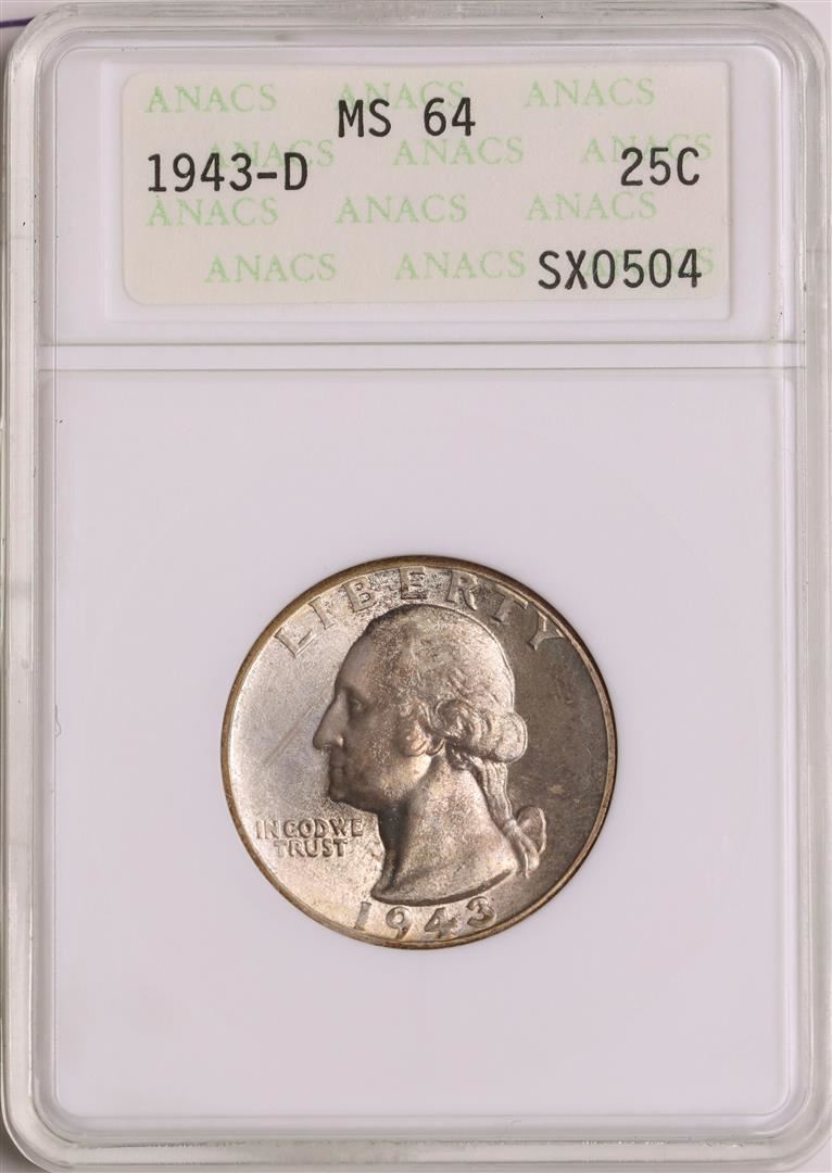 One 1943-D Washington Quarter Coin ANACS MS64. ANACS Certified.